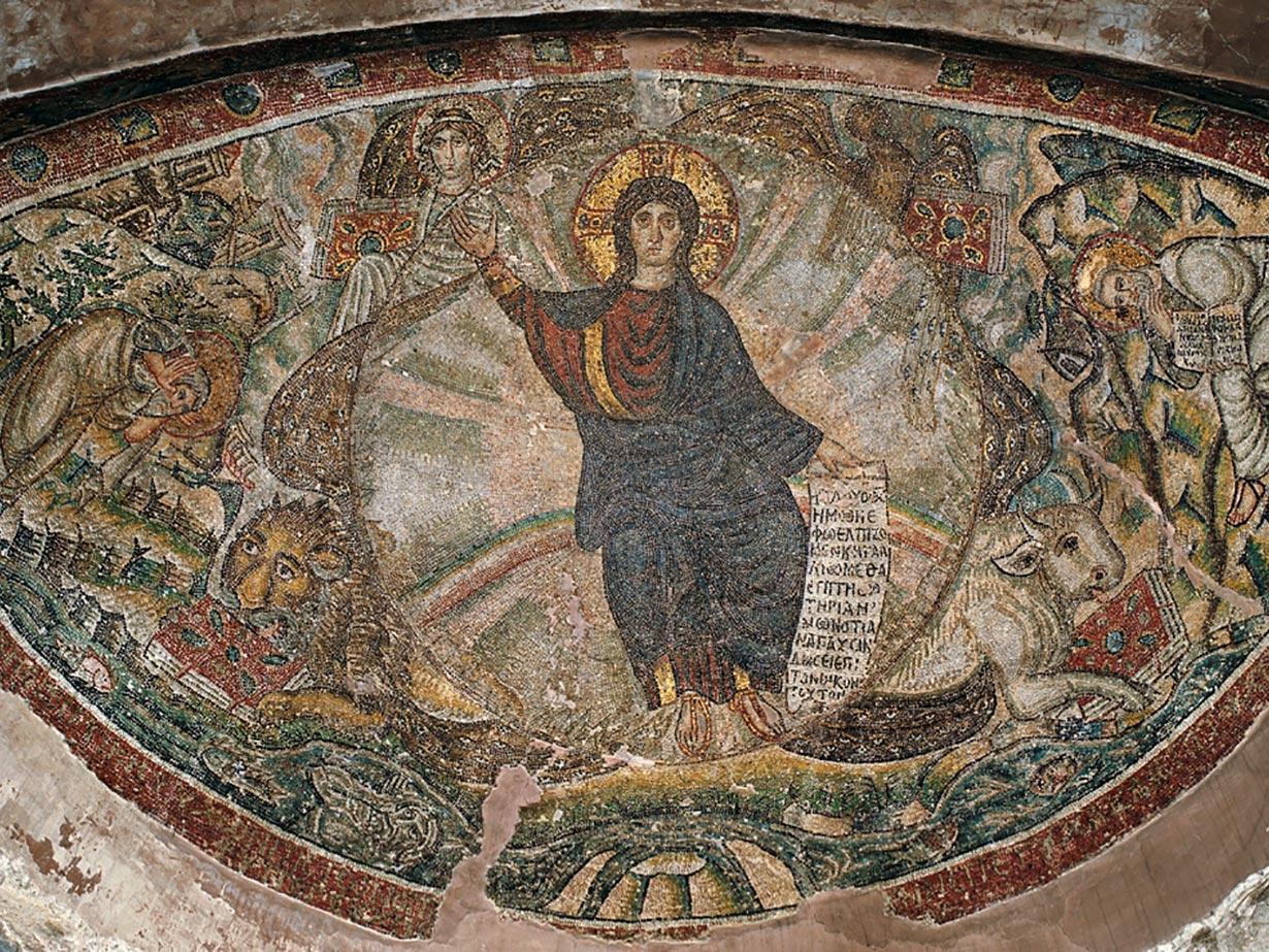 The unique example of Early Christian art is the mosaic of the conch at the altar area. It depicts the vision of prophet Ezekiel with Christ without a beard, surrounded by heavenly dominions and prophets.